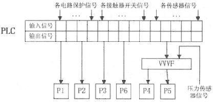 因?yàn)樽冾l器具有短路、過載等保護(hù)功能,所以當(dāng)前變頻器所驅(qū)動的水泵發(fā)生上述故障時變頻器將自動切斷一次供電回路,進(jìn)入保護(hù)狀態(tài)并輸出報(bào)警信號。PLC對這些報(bào)警信號進(jìn)行檢測,而后進(jìn)行備用水泵的投入。具體過程為PLC檢測到報(bào)警信號后首先分?jǐn)喈?dāng)前水泵的接觸器,后對變頻器復(fù)位,然后接通備用水泵的接觸器,啟動變頻器運(yùn)行備用水泵。同時輸出該泵故障報(bào)警信號。