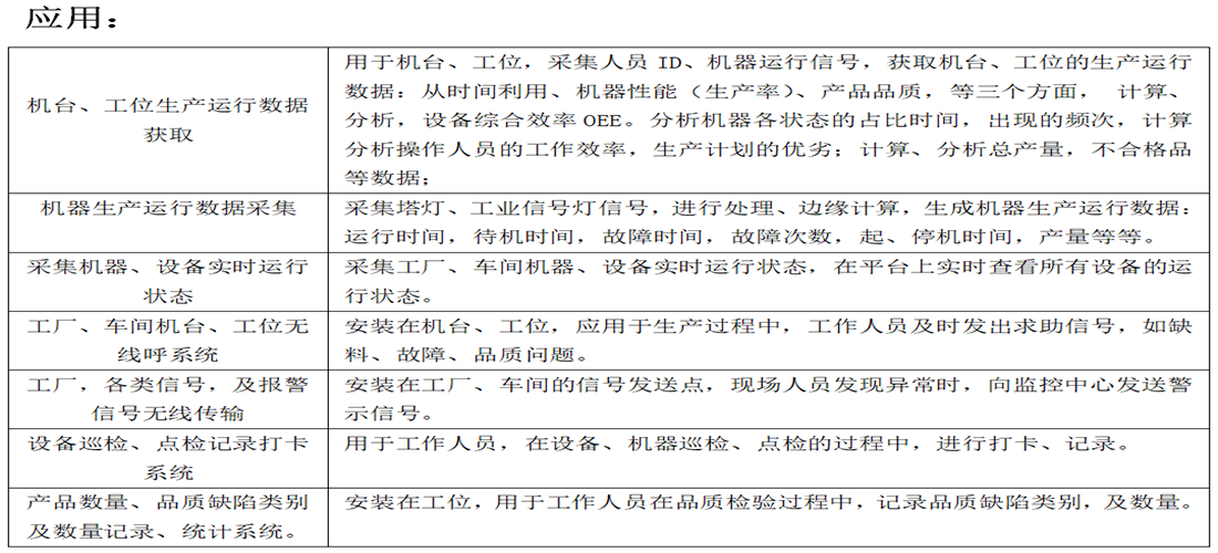 XL69機臺監(jiān)控裝置,采集機臺、工位人、機生產(chǎn)運行信號:機器運行狀態(tài)、人員ID信息及操作時間數(shù)據(jù),獲取機器、人員生產(chǎn)運行數(shù)據(jù),并對機臺的運行數(shù)據(jù)進(jìn)行邊緣計算,統(tǒng)計、分析機臺的設(shè)備效率、時間效率、品質(zhì)效率,及綜合效率。通過無線方式,上傳獲取的數(shù)據(jù)。