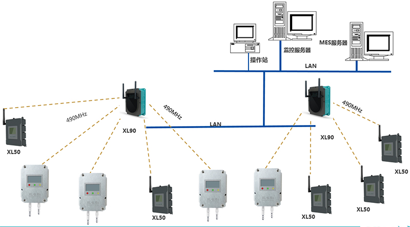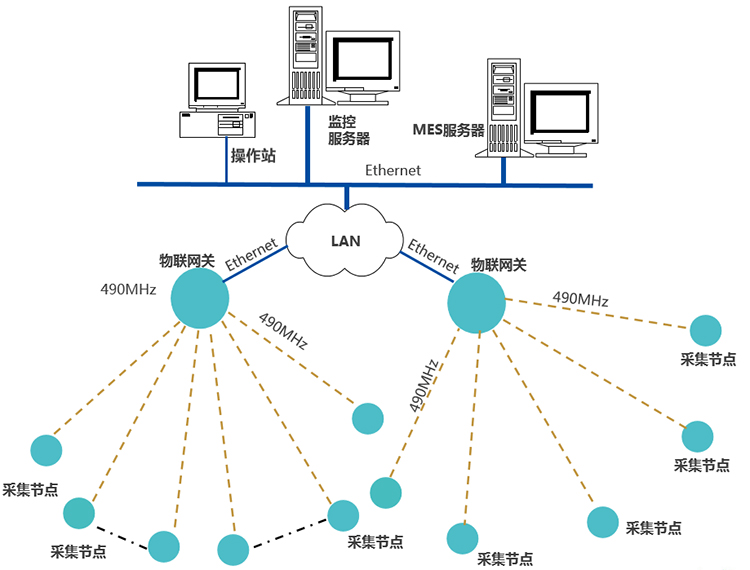 采集節(jié)點(diǎn),通過490MHz無線上傳數(shù)據(jù)至物聯(lián)網(wǎng)關(guān),網(wǎng)關(guān)通過Ethernet,接入LAN,推送數(shù)據(jù)至MES服務(wù)器