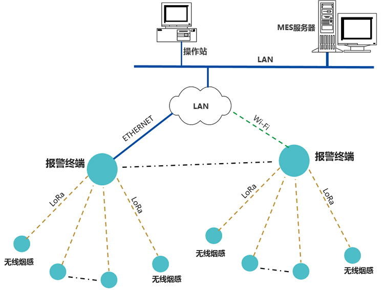報警終端通過無線,獲取管轄區(qū)域內(nèi),煙感監(jiān)測點(diǎn)的數(shù)據(jù),通過ETHERNET,或Wi-Fi,推送數(shù)據(jù)至工廠MES服務(wù)器,通信協(xié)議為工廠MQTT數(shù)據(jù)格式。