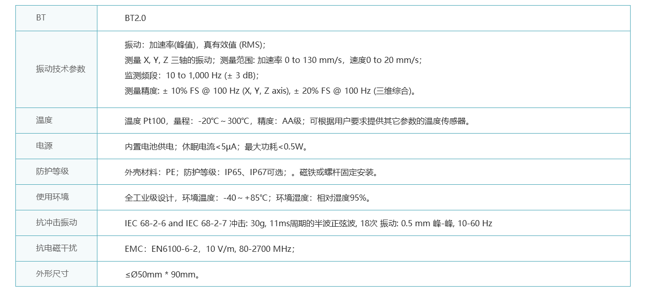 XL11TV無線溫度振動(dòng)傳感器,是信立科技的更新一代智能傳感器,體積更小、功耗更低、更智能,集成振動(dòng)、溫度傳感元件,可監(jiān)測X、Y、Z三個(gè)軸的振動(dòng)數(shù)據(jù)和一個(gè)點(diǎn)的溫度數(shù)據(jù),用于判定工業(yè)旋轉(zhuǎn)機(jī)械(電動(dòng)機(jī)、減速機(jī)、離心機(jī)等)的運(yùn)行狀態(tài)及隱性故障。