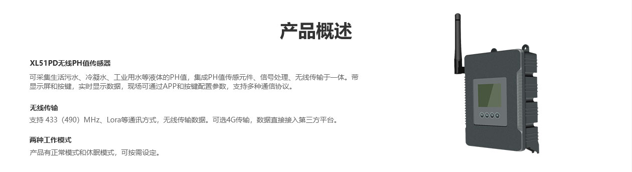 XL51PD無(wú)線PH值傳感器,可采集生活污水、冷凝水、工業(yè)用水等液體的PH值,集成PH值傳感元件、信號(hào)處理、無(wú)線傳輸于一體。帶顯示屏和按鍵,實(shí)時(shí)顯示數(shù)據(jù),現(xiàn)場(chǎng)可通過(guò)APP和按鍵配置參數(shù),支持多種通信協(xié)議。