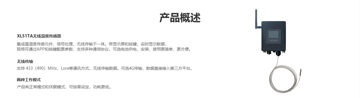 XL51TA無線溫度傳感器,集成溫度傳感元件、信號處理、無線傳輸于一體。帶顯示屏和按鍵,實(shí)時(shí)顯示數(shù)據(jù),現(xiàn)場可通過APP和按鍵配置參數(shù),支持多種通信協(xié)議,可選電池供電,安裝、使用更簡單、更方便。