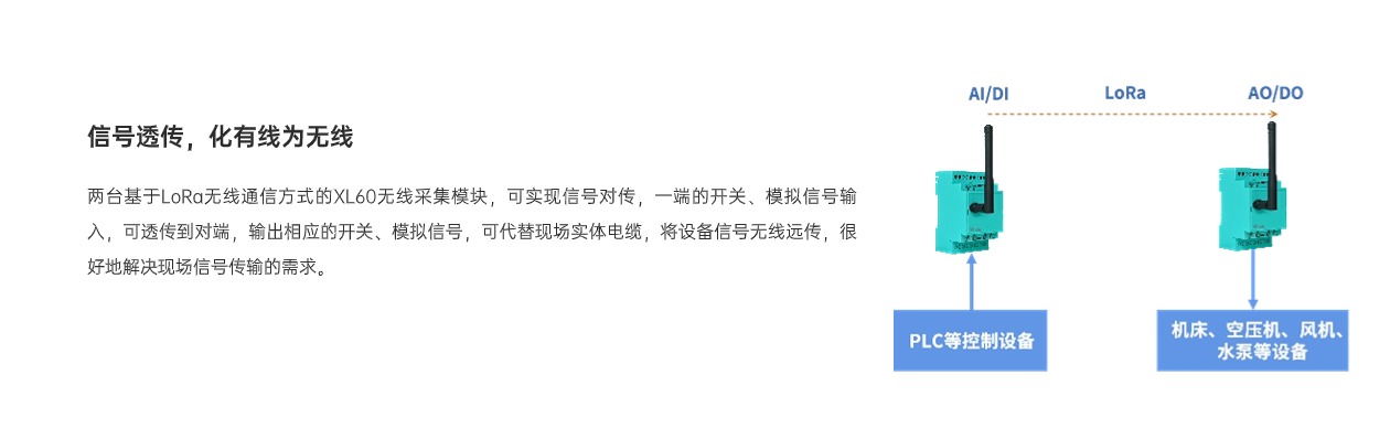 兩臺(tái)XL60采集裝置可實(shí)現(xiàn)信號(hào)對(duì)傳,一端的開(kāi)關(guān)、模擬信號(hào)輸入,可透?jìng)鞯搅硪欢耍敵鱿鄳?yīng)的開(kāi)關(guān)、模擬信號(hào),很好地解決了現(xiàn)場(chǎng)信號(hào)傳輸?shù)男枨蟆?/span>