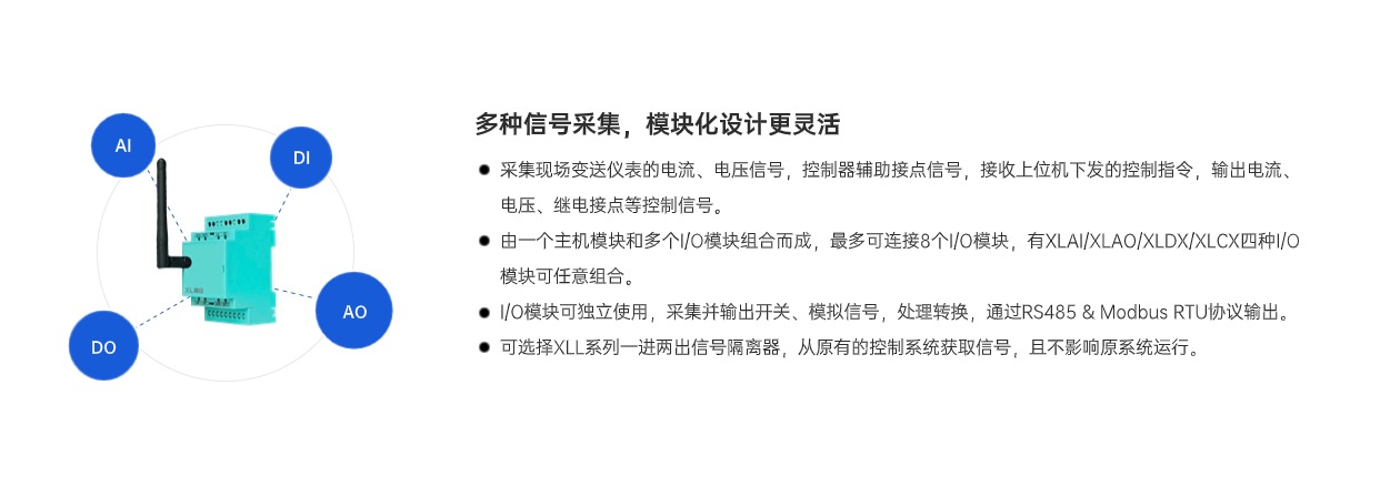 XL60無(wú)線采集模塊,采集模擬、開(kāi)關(guān)信號(hào),輸出模擬、開(kāi)關(guān)信號(hào),可選多種無(wú)線通訊方式。模塊化設(shè)計(jì),更方便擴(kuò)展輸入、輸出數(shù)量。