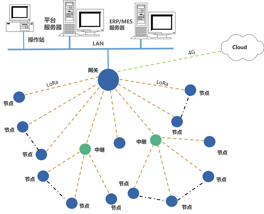 LoRa網(wǎng)絡(luò)是自定義通訊參數(shù)的LoRa通信網(wǎng)絡(luò);設(shè)計(jì)有中繼可延長(zhǎng)無線傳輸距離。物聯(lián)網(wǎng)關(guān)對(duì)節(jié)點(diǎn)的數(shù)據(jù)進(jìn)行通信協(xié)議轉(zhuǎn)換,可選多種通信接口、不同的通信協(xié)議,同時(shí)上傳數(shù)據(jù)至多個(gè)平臺(tái)服務(wù)器。