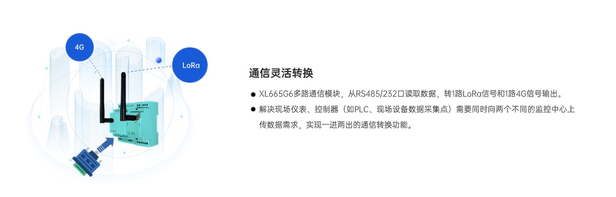 XL665G6多路通信模塊是一款高效靈活的通信轉(zhuǎn)換設(shè)備,可將RS485設(shè)備的一路輸出信號(hào),轉(zhuǎn)為1路LoRa輸出信號(hào)和1路4G輸出信號(hào),有效滿(mǎn)足了工控設(shè)備同時(shí)將數(shù)據(jù)接入兩個(gè)Modbus主站的需求,簡(jiǎn)單、方便、易用,成本更低,滿(mǎn)足多種場(chǎng)景需求。