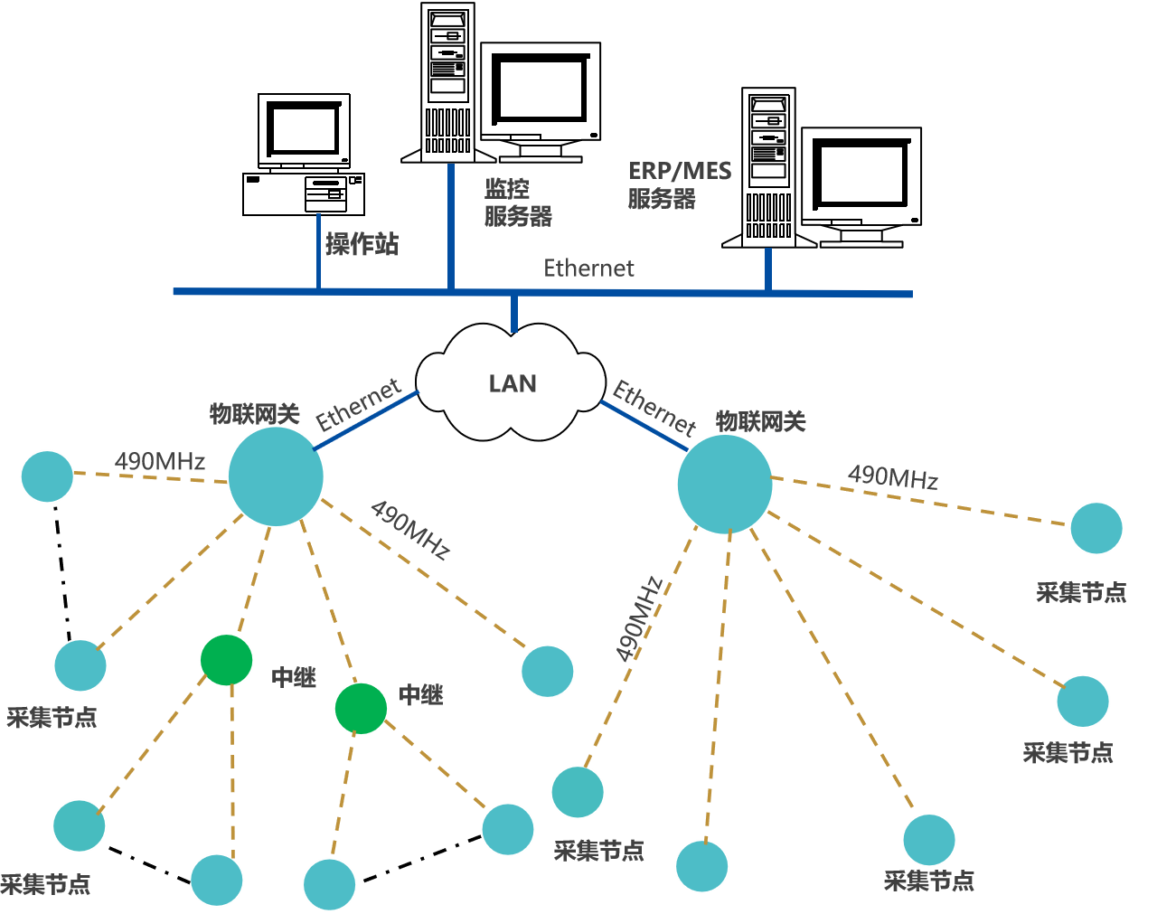 采集節(jié)點(diǎn)數(shù)據(jù),通過LoRa上傳數(shù)據(jù)至物聯(lián)網(wǎng)關(guān),網(wǎng)關(guān)通過Ethernet或Wi-Fi,接入LAN,推送數(shù)據(jù)至企業(yè)生產(chǎn)管控服務(wù)器