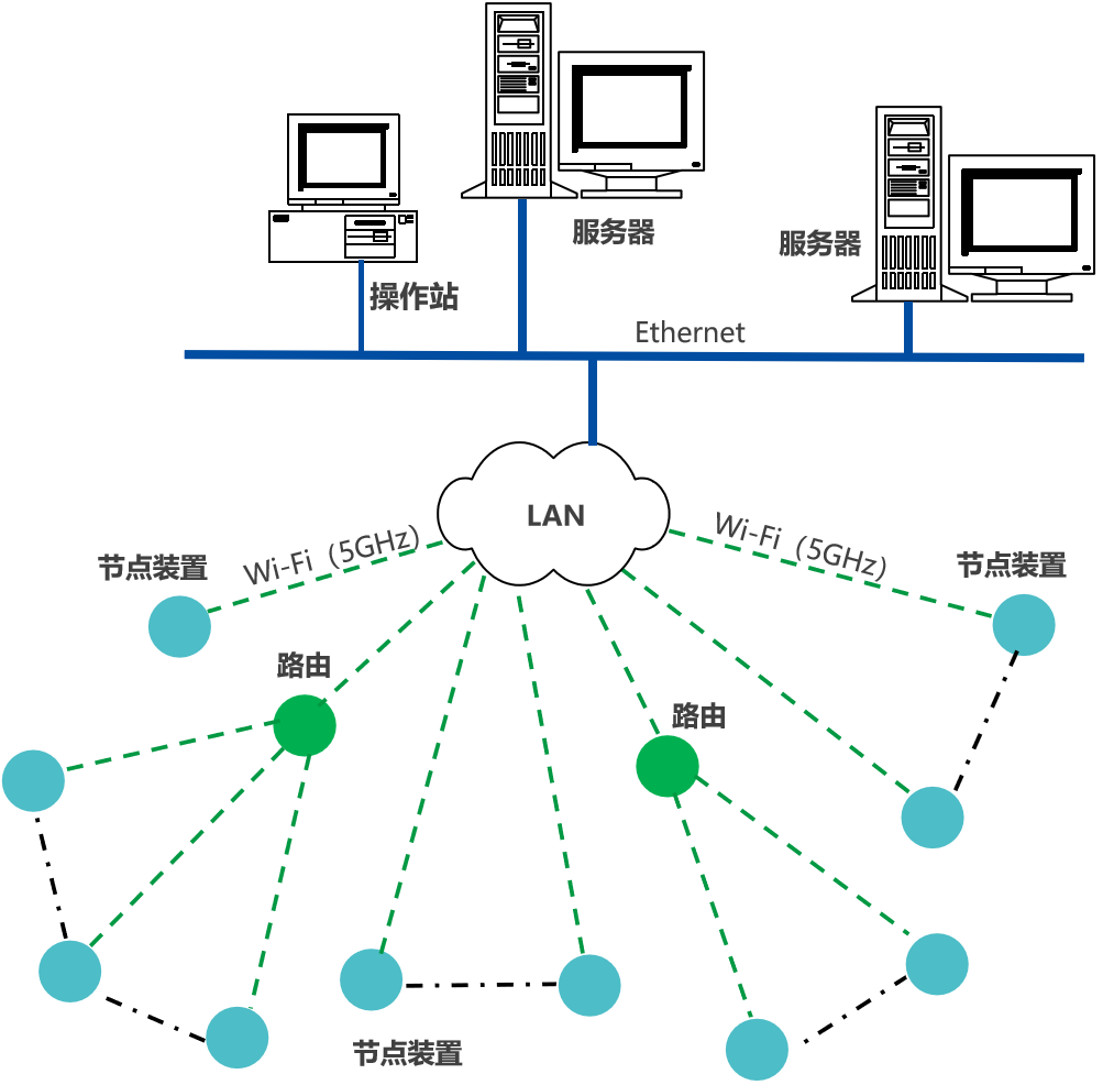 節(jié)點裝置(采集點裝置),通過Wi-Fi(5GHz),接入企業(yè)內(nèi)部LAN,推送設備生產(chǎn)數(shù)據(jù),至企業(yè)生產(chǎn)監(jiān)控平臺