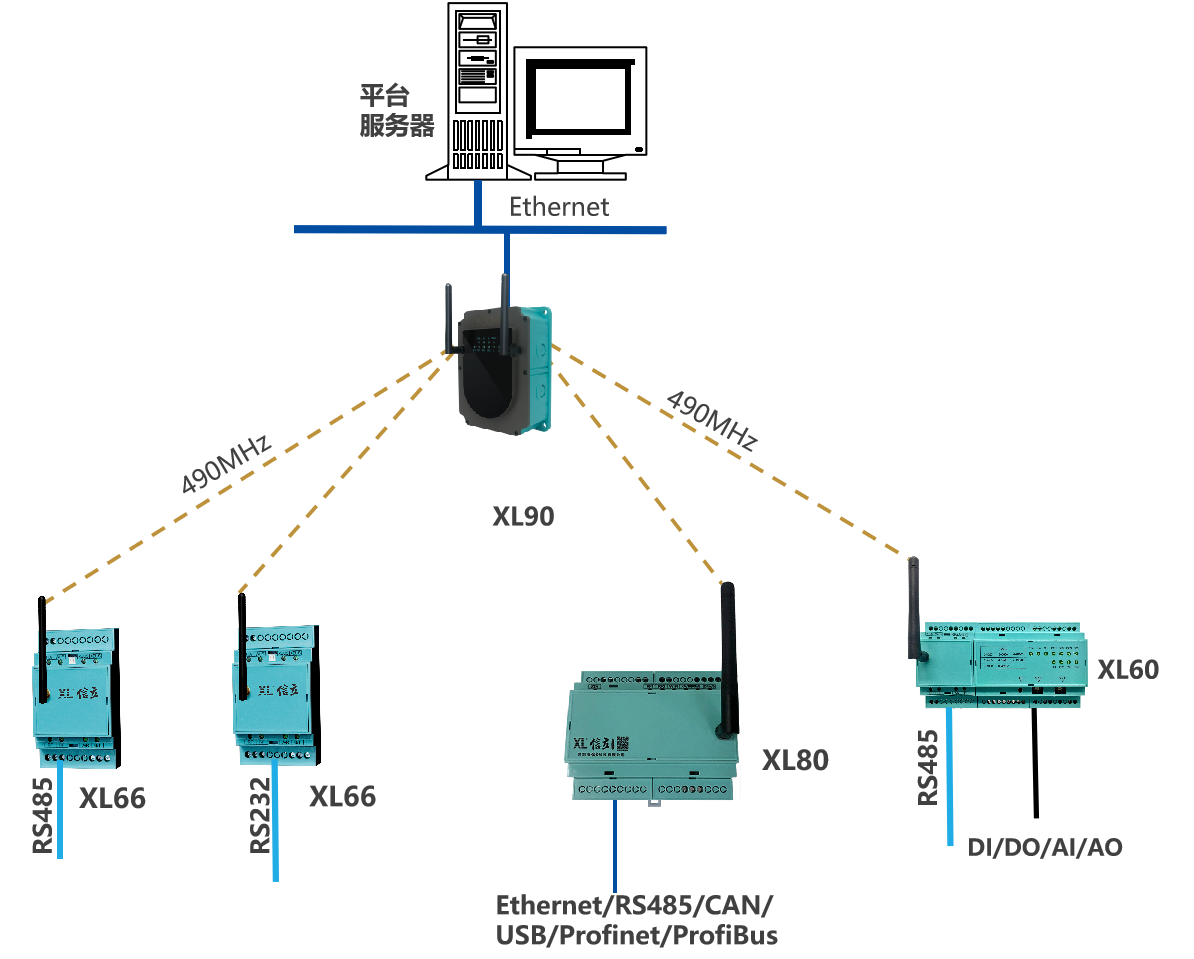 類似泵房、水廠、水源井等場所的數(shù)據(jù)監(jiān)測,監(jiān)測點的數(shù)據(jù)先上傳至XL90物聯(lián)網(wǎng)關,再通過NB/GPRS/LTE轉(zhuǎn)發(fā)數(shù)據(jù)至云平臺,此種情況,數(shù)以后在量大時,可選LTE(4g)方式
