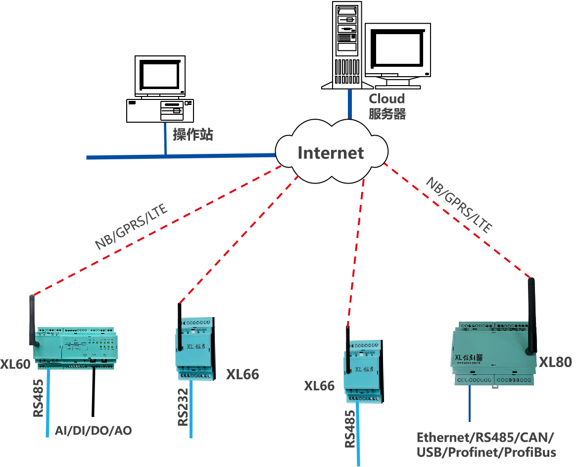 XL60智能采集裝置,通過RS485接口讀取數(shù)據(jù),DI、DO、AI、AO接口采集、輸出信號,NB/GPRS/LTE通信;推薦NB/GPRS