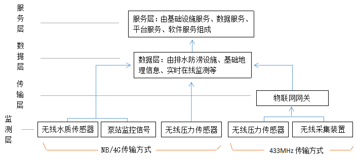 ?2、傳輸層:傳輸層主要有無(wú)線采集裝置、無(wú)線壓力傳感器、NB、4G、Lora無(wú)線傳輸網(wǎng)絡(luò)組成。