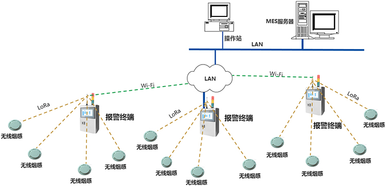 報警終端通過無線,獲取管轄區(qū)域內(nèi),煙感監(jiān)測點(diǎn)的數(shù)據(jù),通過ETHERNET,或Wi-Fi,推送數(shù)據(jù)至工廠MES服務(wù)器,通信協(xié)議為工廠MQTT數(shù)據(jù)格式。