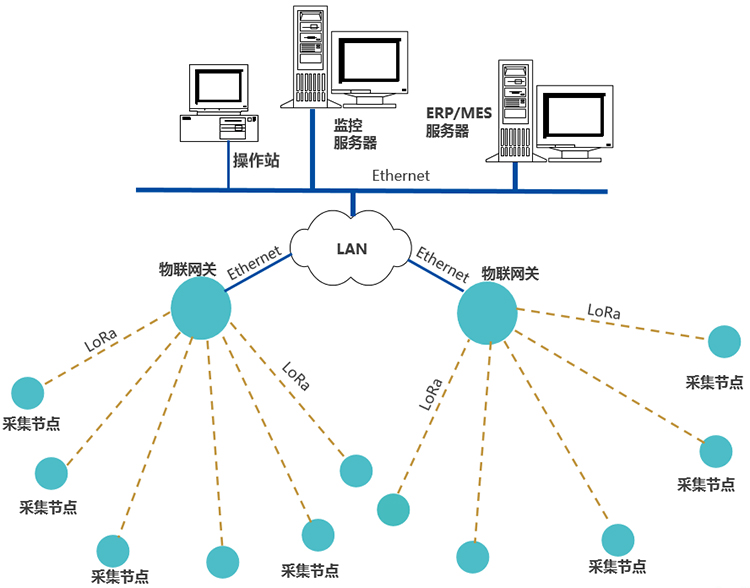 每個采集裝置、傳感器,通過LoRa無線通訊上傳數(shù)據(jù)至物聯(lián)網(wǎng)關(guān),網(wǎng)關(guān)通過Ethernet或Wi-Fi,接入LAN,推送數(shù)據(jù)至企業(yè)生產(chǎn)管控服務(wù)器。
