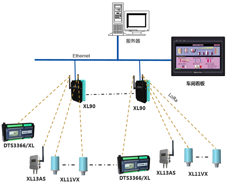基于XIoT技術(shù)的回流爐運行狀態(tài)數(shù)據(jù)集系統(tǒng),選擇DTSD3366/XL電力監(jiān)測儀表,XL13AS無線風速傳感器、XL11VX無線振動傳感器,采集回流爐運行數(shù)據(jù),無線上傳數(shù)據(jù)至XL90物聯(lián)網(wǎng)關(guān):