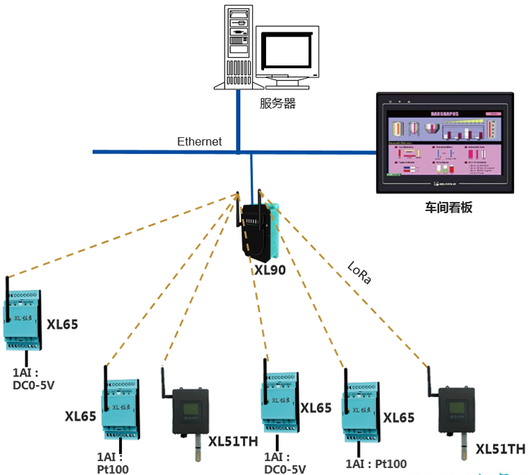 基于XIoT技術(shù)的絲印機電池電壓、電機溫度、絲印空間溫、濕度數(shù)據(jù)采集系統(tǒng),選擇XL65無線采集裝置,和XL51TH溫、濕度傳感器,采集相關(guān)參數(shù)的數(shù)據(jù),無線上傳至XL90物聯(lián)網(wǎng)關(guān):