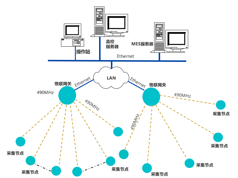 采集節(jié)點,通過490MHz無線上傳數(shù)據(jù)至物聯(lián)網(wǎng)關(guān),網(wǎng)關(guān)通過Ethernet,接入LAN,推送數(shù)據(jù)至MES服務(wù)器;