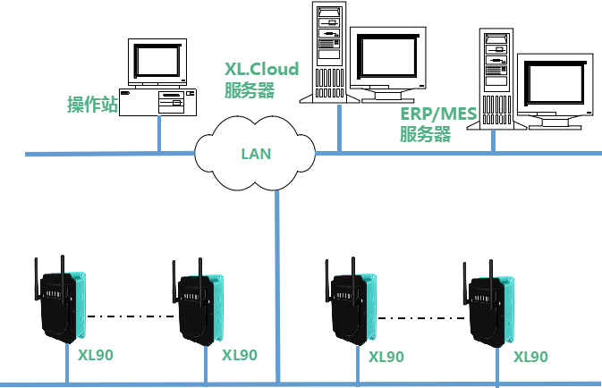 平臺系統(tǒng)的通信網(wǎng)絡(luò),由XL90物聯(lián)網(wǎng)關(guān),企業(yè)局域網(wǎng),和監(jiān)控服務(wù)器構(gòu)成。