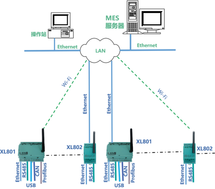 XL80通信主機,從設備通信接口,讀取設備或系統(tǒng)的運行數(shù)據(jù),通信協(xié)議轉(zhuǎn)換處理后,再通過Ethernet或Wi-Fi,接入LAN,轉(zhuǎn)發(fā)數(shù)據(jù)至MES。