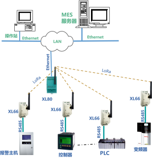 XL80主機,通過LoRa無線接口,從XL66無線讀取設備的運行數(shù)據(jù),通信協(xié)議轉(zhuǎn)換處理后,通過Ethernet,轉(zhuǎn)發(fā)數(shù)據(jù)至MES。