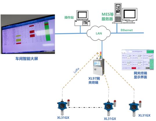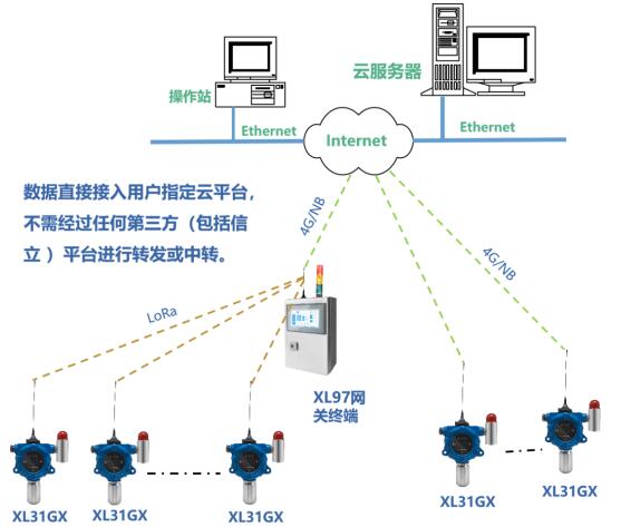 l XL31GX智能氣體檢測儀,通過LoRa接入網(wǎng)關(guān)終端,網(wǎng)關(guān)終端通過4G接入云平臺。