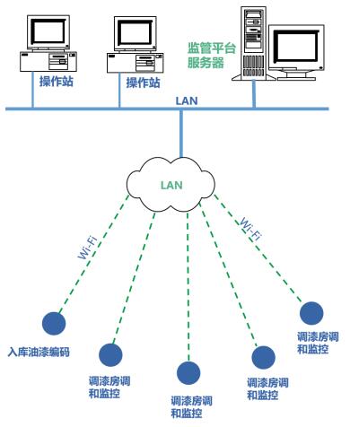 設(shè)計(jì)油漆調(diào)和監(jiān)管系統(tǒng),由監(jiān)管平臺(tái)服務(wù)器、油漆調(diào)和操作監(jiān)控終端、電子枰、油漆編碼終端、操作站等構(gòu)成,通過工廠內(nèi)的局域網(wǎng)(WI-FI)進(jìn)行通信連接。