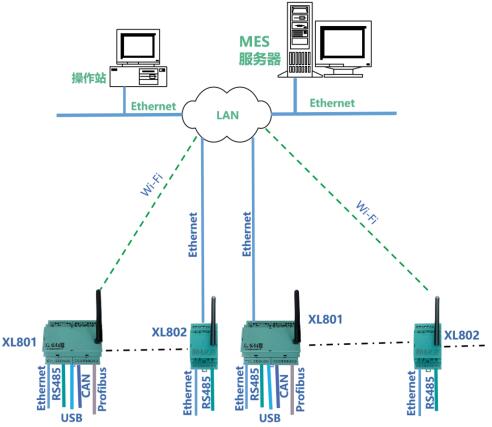 XL80通信主機(jī),從設(shè)備通信接口,讀取設(shè)備或系統(tǒng)的運(yùn)行數(shù)據(jù),通信協(xié)議轉(zhuǎn)換處理后,再通過(guò)Ethernet或Wi-Fi,接入LAN,轉(zhuǎn)發(fā)數(shù)據(jù)至MES。