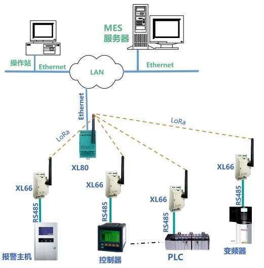 XL80主機(jī),通過(guò)LoRa無(wú)線接口,從XL66無(wú)線讀取設(shè)備的運(yùn)行數(shù)據(jù),通信協(xié)議轉(zhuǎn)換處理后,通過(guò)Ethernet,轉(zhuǎn)發(fā)數(shù)據(jù)至MES。
