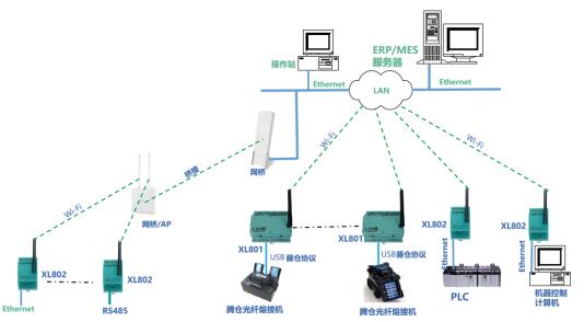 對(duì)于安裝分散,離LAN接口遠(yuǎn)的設(shè)備,設(shè)計(jì)XL80安裝在LAN口附近接入局域網(wǎng),選擇XL66無(wú)線轉(zhuǎn)換器,連接設(shè)備RS485/RS232接口,實(shí)現(xiàn)設(shè)備無(wú)線聯(lián)接XL80通信主機(jī)。