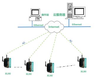 對于安裝分散、距離遠的監(jiān)測點,可通過XL90網(wǎng)關(guān)構(gòu)建一個小的物聯(lián)網(wǎng)數(shù)據(jù)采集系統(tǒng)。網(wǎng)關(guān)無線讀取區(qū)域內(nèi)各監(jiān)測點的數(shù)據(jù),通過4G推送數(shù)據(jù)至云平臺。