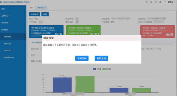 智能更新料重:當(dāng)某種原料倒入過(guò)多,系統(tǒng)彈窗報(bào)警,經(jīng)上級(jí)權(quán)限確認(rèn)后系統(tǒng)根據(jù)給定配比,自動(dòng)更新各原料所需重量。