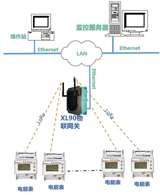 DTSD3366XX/XL無(wú)線多功能電能表獲取數(shù)據(jù),通過(guò)LoRa無(wú)線傳輸方式上傳至XL90網(wǎng)關(guān);XL90網(wǎng)關(guān)計(jì)算分析讀取的能耗數(shù)據(jù),并通過(guò)Ethernet、Wi-Fi、4G等通信方式,將數(shù)據(jù)上傳至XLSCADA平臺(tái)。