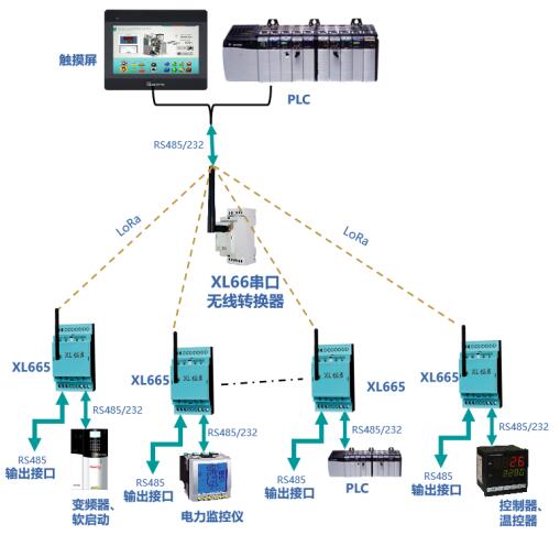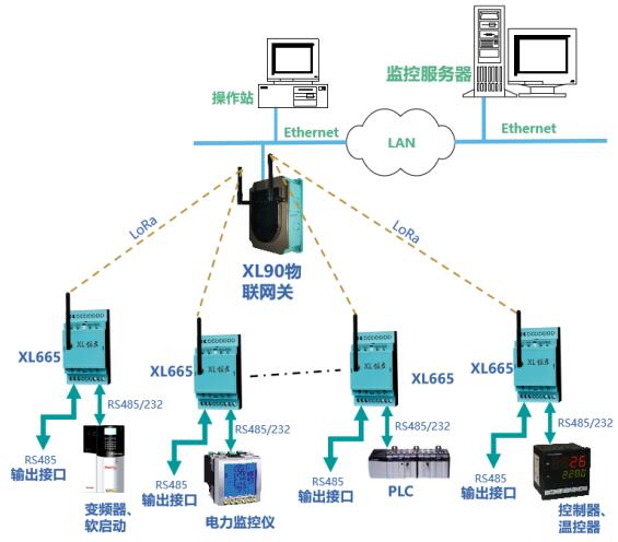通過(guò)LoRa無(wú)線(xiàn)傳輸模塊輸出的數(shù)據(jù),可上傳至XL90物聯(lián)網(wǎng)關(guān)接入監(jiān)控軟件平臺(tái),或通過(guò)XL66串口無(wú)線(xiàn)轉(zhuǎn)換器,與PLC、觸摸屏等通信。