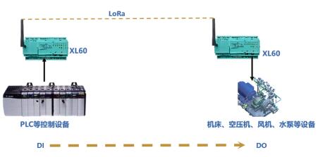 選用一對(duì)基于LoRa無(wú)線傳輸模塊的XL60無(wú)線采集裝置,一臺(tái)配置在作業(yè)現(xiàn)場(chǎng)作信號(hào)接收端,一臺(tái)與PLC等控制儀表對(duì)接作信號(hào)發(fā)射端。發(fā)射端的XL60將控制儀表的啟停命令,通過(guò)LoRa無(wú)線對(duì)傳到接收端,實(shí)現(xiàn)無(wú)線遠(yuǎn)程控制設(shè)備啟、停。