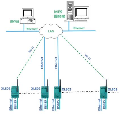 數(shù)據(jù)聯(lián)網(wǎng):XL80通信主機從設(shè)備通信接口讀取設(shè)備或系統(tǒng)的運行數(shù)據(jù),通信協(xié)議轉(zhuǎn)換處理后,再通過Ethernet或Wi-Fi,接入企業(yè)LAN,轉(zhuǎn)發(fā)數(shù)據(jù)至MES或監(jiān)控平臺。