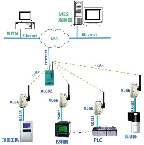 數(shù)據(jù)聯(lián)網(wǎng):XL80主機通過LoRa無線傳輸技術(shù),從XL66無線讀取設(shè)備的運行數(shù)據(jù),通信協(xié)議轉(zhuǎn)換處理后,通過Ethernet轉(zhuǎn)發(fā)數(shù)據(jù)至MES或監(jiān)控平臺。