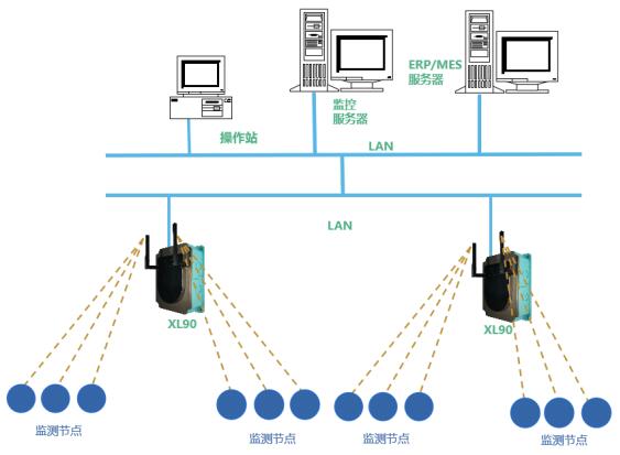 解決方案:XL90物聯(lián)網(wǎng)關(guān)無線讀取監(jiān)測節(jié)點(diǎn)的數(shù)據(jù),進(jìn)行處理、協(xié)議轉(zhuǎn)換,通過以太網(wǎng)(Ethernet)或Wi-Fi,接入局域網(wǎng)轉(zhuǎn)發(fā)數(shù)據(jù)至MES、ERP、EMS等工廠數(shù)字化平臺。