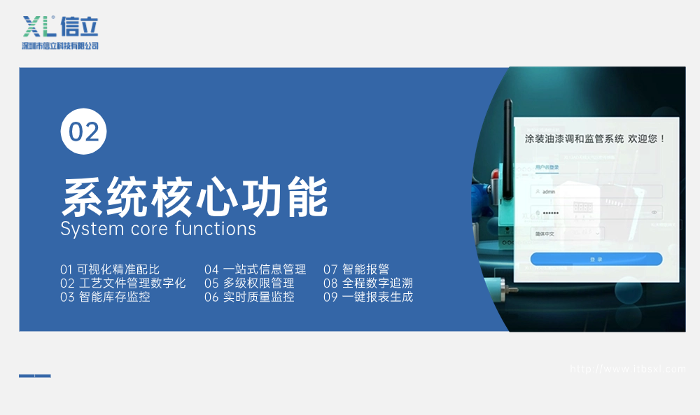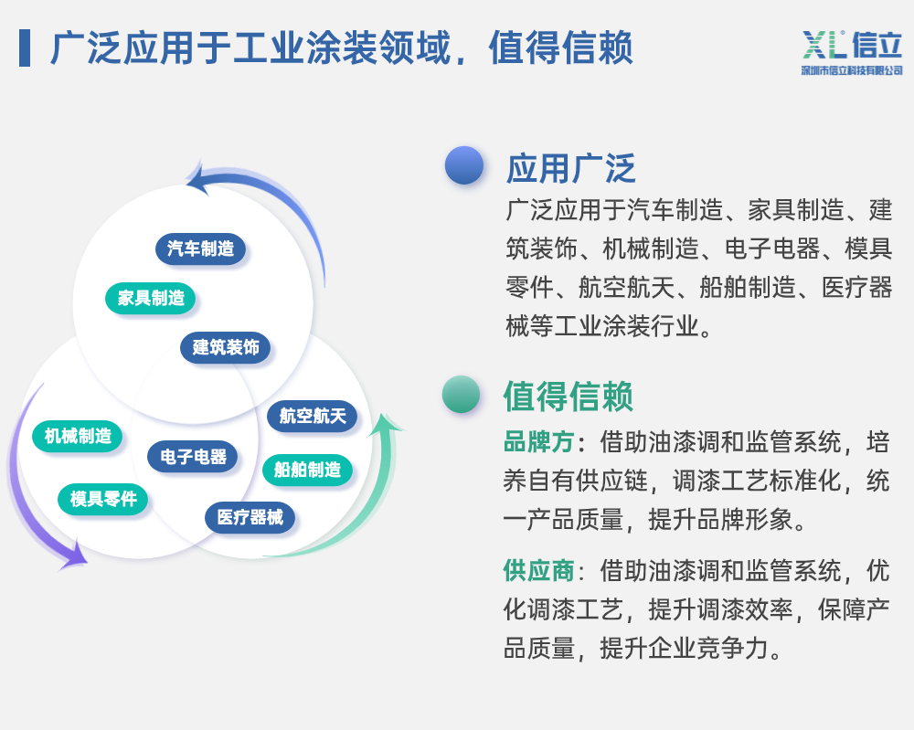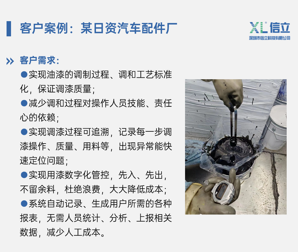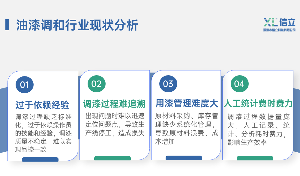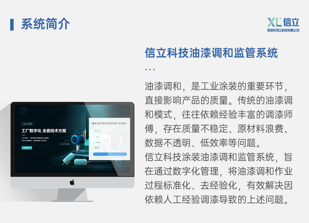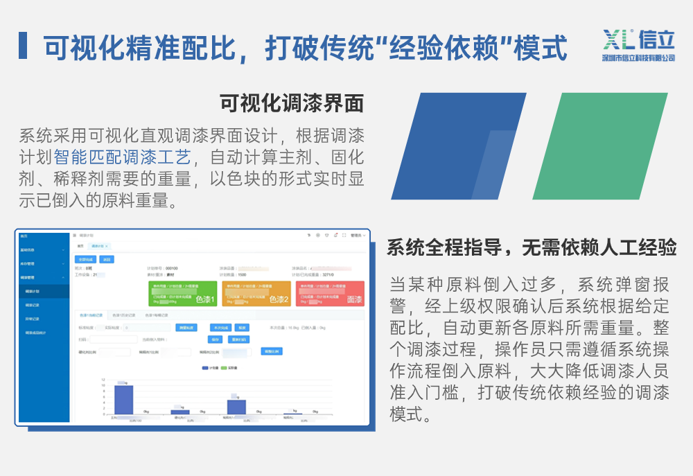 信立科技涂裝油漆調(diào)和監(jiān)管系統(tǒng),旨在通過(guò)數(shù)字化管理,將油漆調(diào)和作業(yè)過(guò)程標(biāo)準(zhǔn)化、去經(jīng)驗(yàn)化,有效解決因依賴(lài)人工經(jīng)驗(yàn)調(diào)漆導(dǎo)致的上述問(wèn)題。