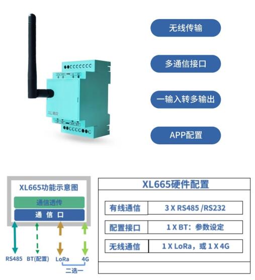 一路RS485信號,經(jīng)由XL665無線轉(zhuǎn)換器,輸出一路RS485信號和一路LoRa無線信號,同時接入兩個不同的設(shè)備(系統(tǒng))。