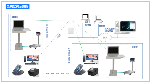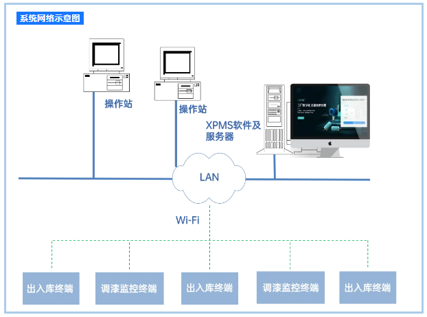 信立智能調(diào)漆系統(tǒng)XPMS由服務器及平臺軟件、調(diào)漆終端、出入庫終端、Wi-Fi網(wǎng)絡(luò)構(gòu)成。