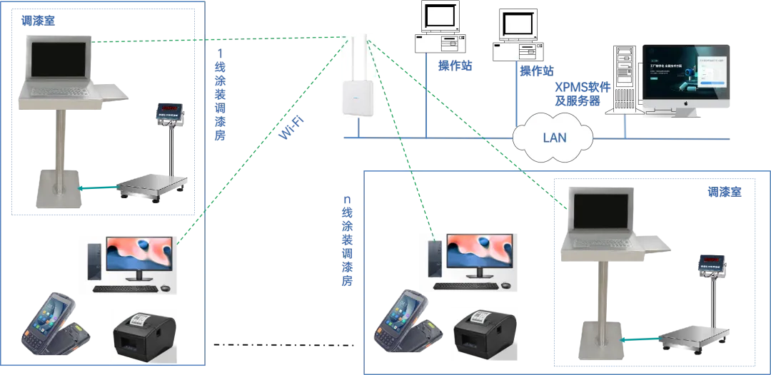 信立智能調漆系統(tǒng)由服務器及平臺軟件、調漆終端、出入庫終端、Wi-Fi網(wǎng)絡構成。