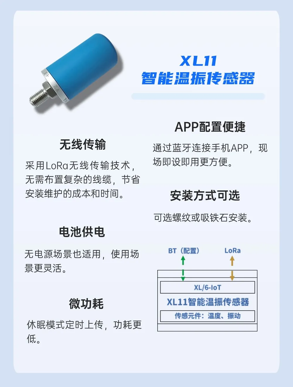 選擇XL11智能溫振傳感器,安裝在高爐、轉(zhuǎn)爐、連鑄機(jī)、熔煉爐等設(shè)備的電機(jī)和減速機(jī)上,實時采集溫度和X、Y、Z三個方向的振動數(shù)據(jù),為設(shè)備運(yùn)行狀態(tài)的分析判斷提供數(shù)據(jù)支撐。
