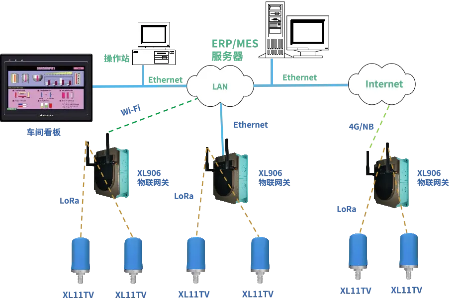 XL11智能溫振傳感器通過LoRa無線傳輸溫度和振動數(shù)據(jù)至XL906物聯(lián)網(wǎng)關(guān),網(wǎng)關(guān)對數(shù)據(jù)進(jìn)行處理、協(xié)議轉(zhuǎn)換,通過Ethernet、Wi-Fi、4G等通信方式,將數(shù)據(jù)上傳至監(jiān)控中心或云平臺。