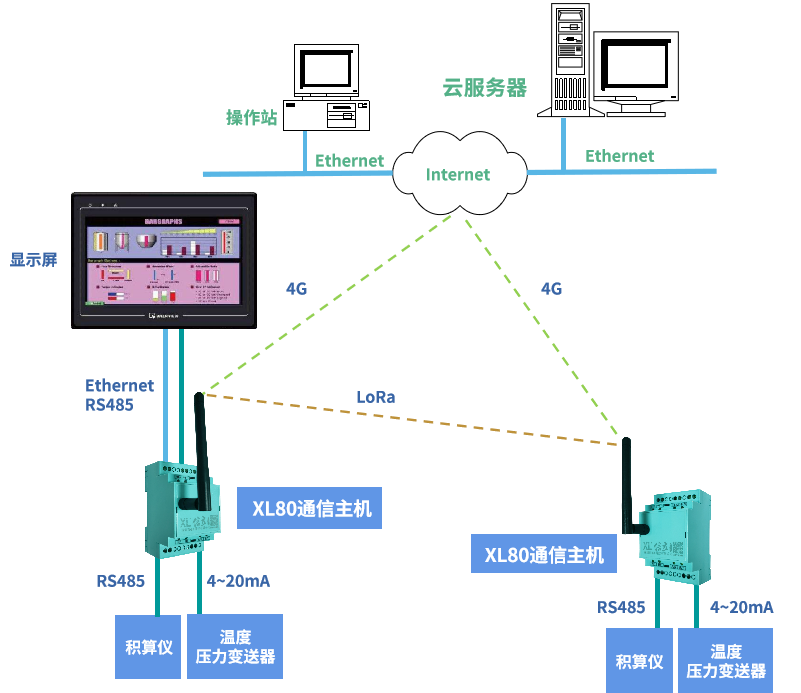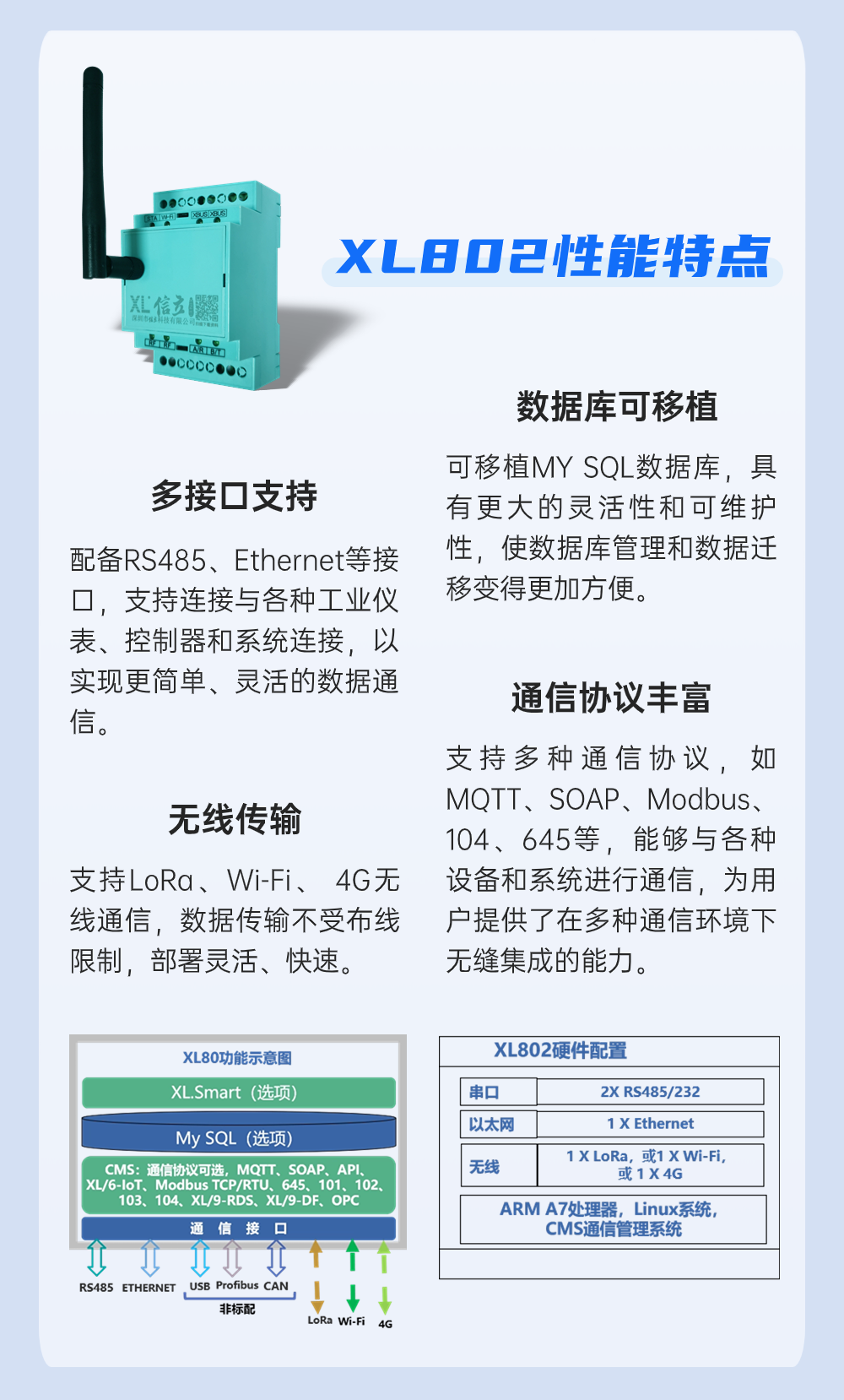 XL802通信主機,可同時將數(shù)據(jù)推送到現(xiàn)場顯示儀表、物聯(lián)網(wǎng)關,實現(xiàn)現(xiàn)場就地監(jiān)控和平臺遠程監(jiān)控。