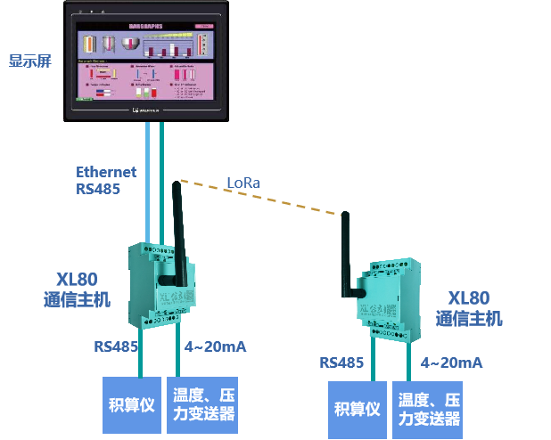 在采集壓力變送器、積算儀等儀表信號的同時,通過LoRa無線讀取其他采集點的數(shù)據(jù),通過以太網(wǎng)或RS485接入現(xiàn)場觸摸屏、數(shù)顯表等顯示設備,實時展示當前管道運行數(shù)據(jù)。