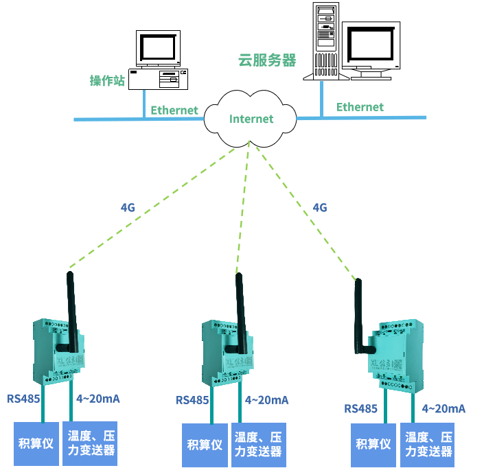 管網(wǎng)上已安裝的流量計、積算儀、壓力變送器、溫度變送器等儀表,由于廠家不同,通信接口可能不統(tǒng)一,選擇XL802通信主機,搭配XLAI模擬量輸入模塊,可同時讀取儀表4~20mA、RS485通信接口的信號,將管道壓力、溫度、瞬時流量、累積流量等關鍵數(shù)據(jù),無線遠傳至監(jiān)控平臺。