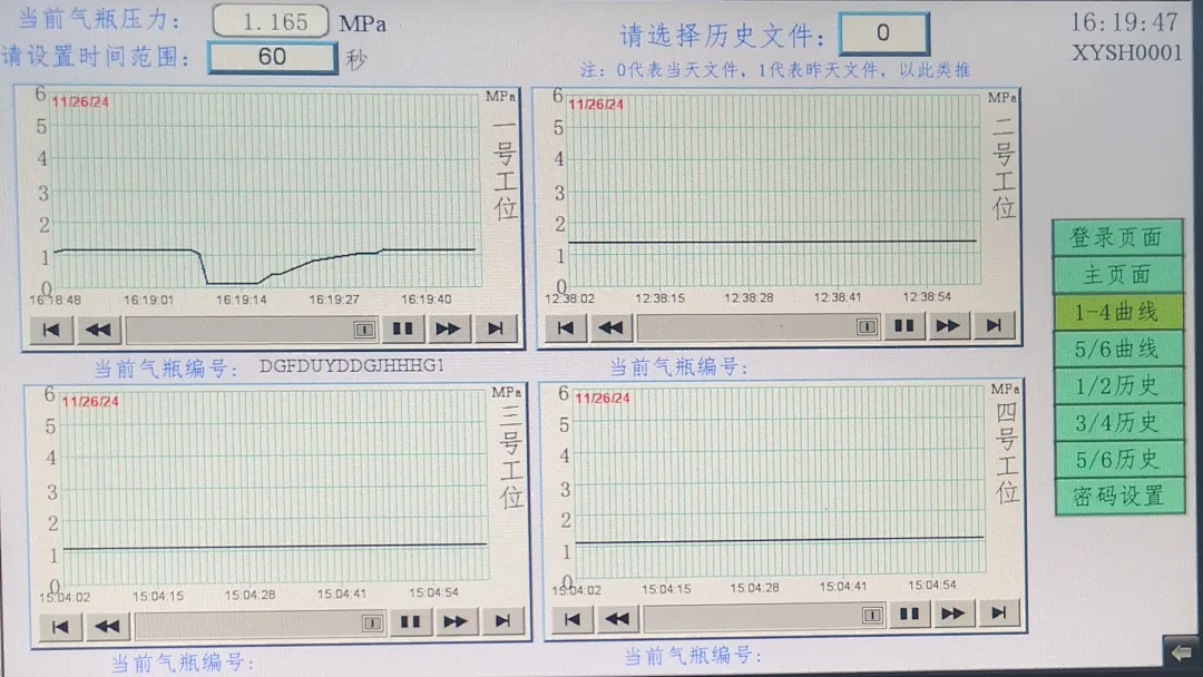 歷史記錄:自動(dòng)記錄測(cè)試時(shí)間、操作員身份信息、工位信息、鋼瓶身份信息、壓力數(shù)據(jù),生成歷史曲線;